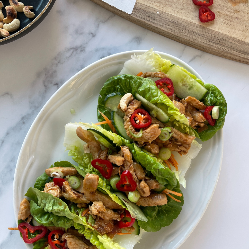 - Assemble the turkey into the lettuce cups and top each one with toasted cashew nuts, spring onion and red chilli. You can also add the rice into the lettuce cups!