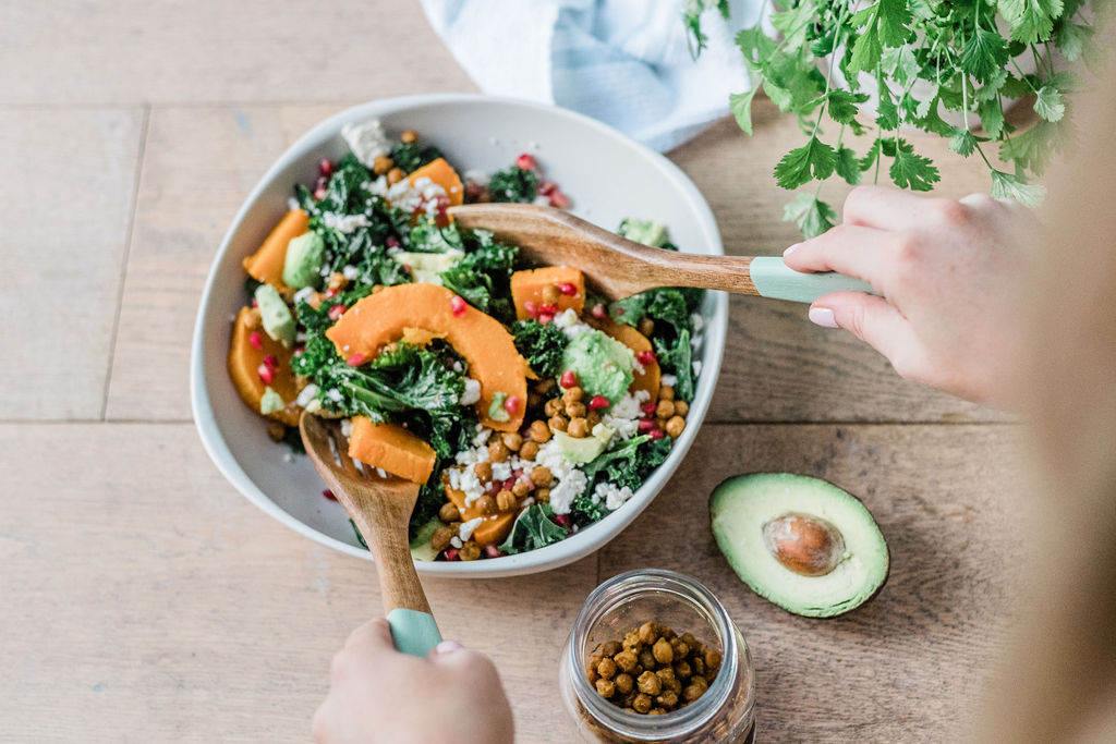- Add squash pieces, avocado chunks, pomegranate seeds, chickpeas and crumbled feta